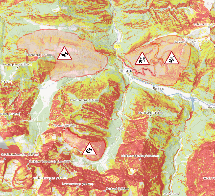 Nach den Grundsätzen des „Tiroler Ski- und Snowboardtourenkonzeptes“ haben sich die Partner im Projekt „Skitourenregion Naturpark Karwendel“ auf drei Schutzgüter geeinigt, deren Schutzzonen die Skibergsteiger freiwillig meiden sollten.