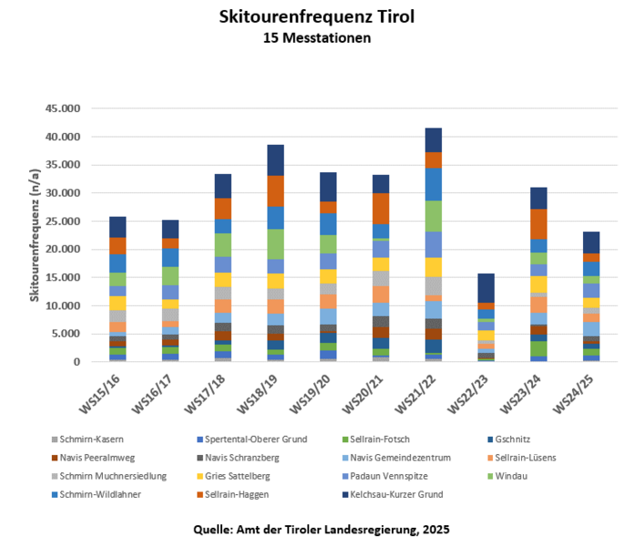 Wir haben 15 Messstationen in ganz Tirol ausgewertet. Dadurch ergibt sich ein Bild, wie sich das Skitourengehen in Tirol in den letzten zehn Wintersaisonen entwickelt hat. Die wesentlichsten Aussagen, die wir daraus ableiten: